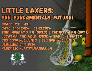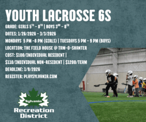 Equipment Needed: Boys’ lacrosse stick, elbow pads, shoulder pads, gloves, protective cup, mouthguard. Sylvania Recreation can provide a helmet.