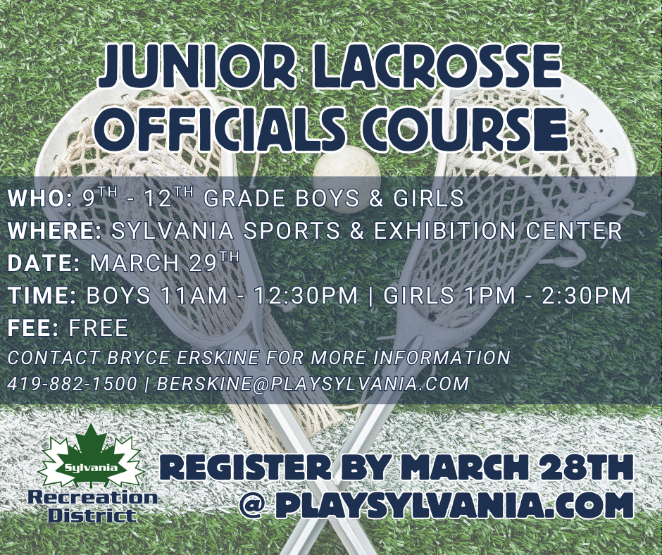 Equipment Needed (Boys): Player must provide boys’ lacrosse stick & gloves. Sylvania Recreation will provide helmet.